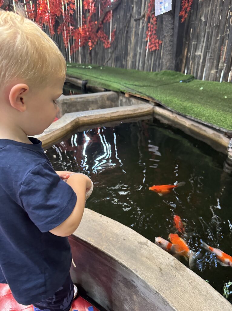 - Highlights: Sit in sunken booths to enjoy your food and drinks. You can feed the fish as you wait for your meal. Have a walk around the narrow garden themed paths and don’t forget to checkout the toilets!